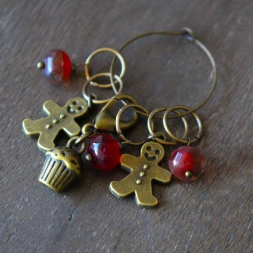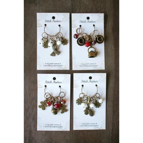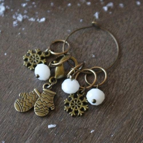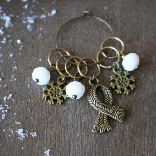 Keep cozy with these adorable winter stitch marker sets made with Czech and crystal glass beads as well as antique bronze charms. Each set consists of 5 ring stitch markers that fit up to a US10 needle and 1 removable progress keeper representing cozy firelit evenings and warm woolens for winter days spent outside.