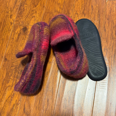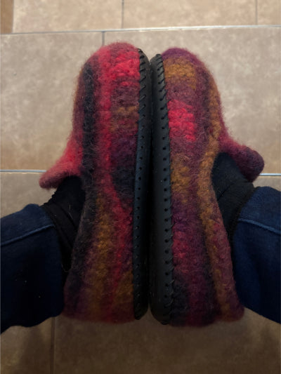 The slippers are knit in the round as well as straight knitting and uses 100% wool yarn, basic knit stitches. Skill level, easy to moderate, short row knitting involved. Machine washing for felting technique.