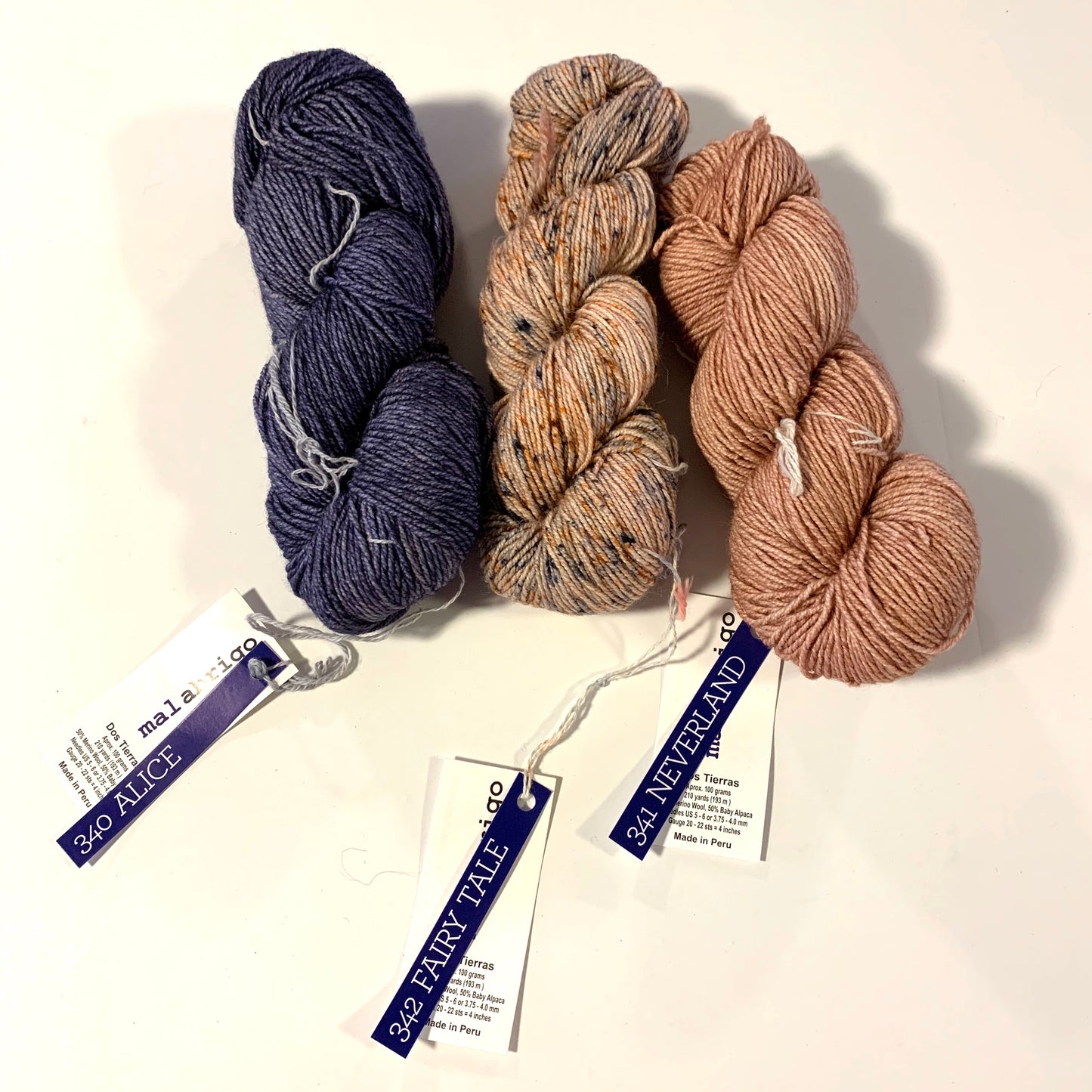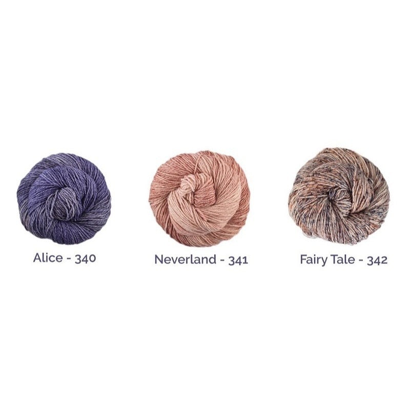 Odyssey Shawl Kit includes 1 skein each - 340 Alice - 341 Neverland - 342 Fairy Tale