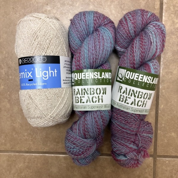 - Berroco Remix Light x 2 skeins (864 yds) and 2 hanks of Queensland Collection Rainbow Beach for CC1 and CC2.