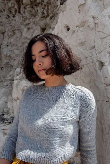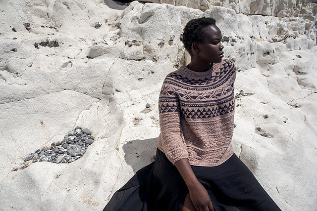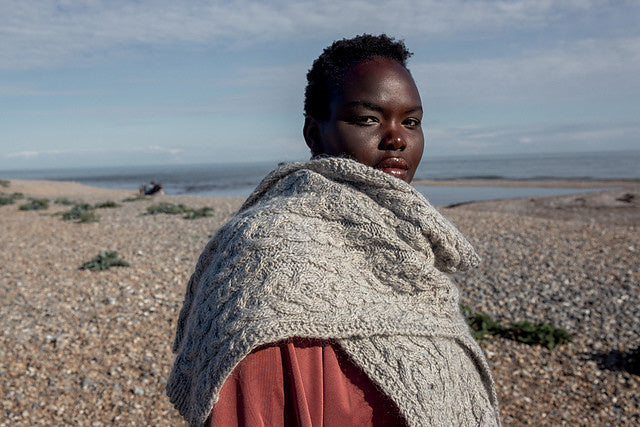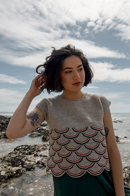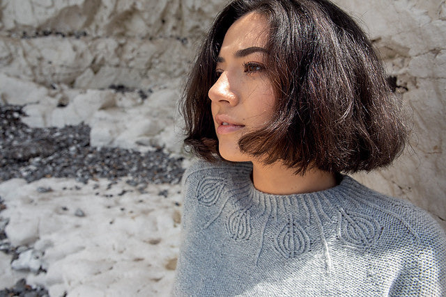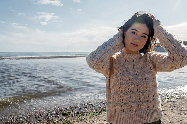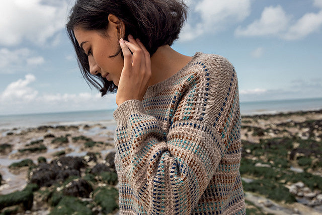The yarn palette draws from the many colours of the sea, as well as the soft shades of sand, shingle, and shells. Our designers have created a treasure chest of patterns: four jumpers, two wraps, a cardi, a tee, and a hat that will see you from high tide to low tide as the season shifts.