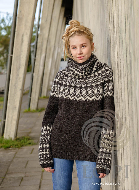 Stranded Lopi pullover sweater kit includes enough yarn for XS up to XXL (89 cm to 111 cm Chest):