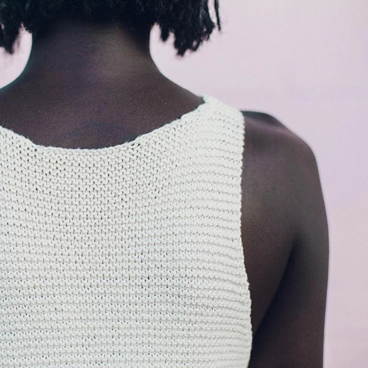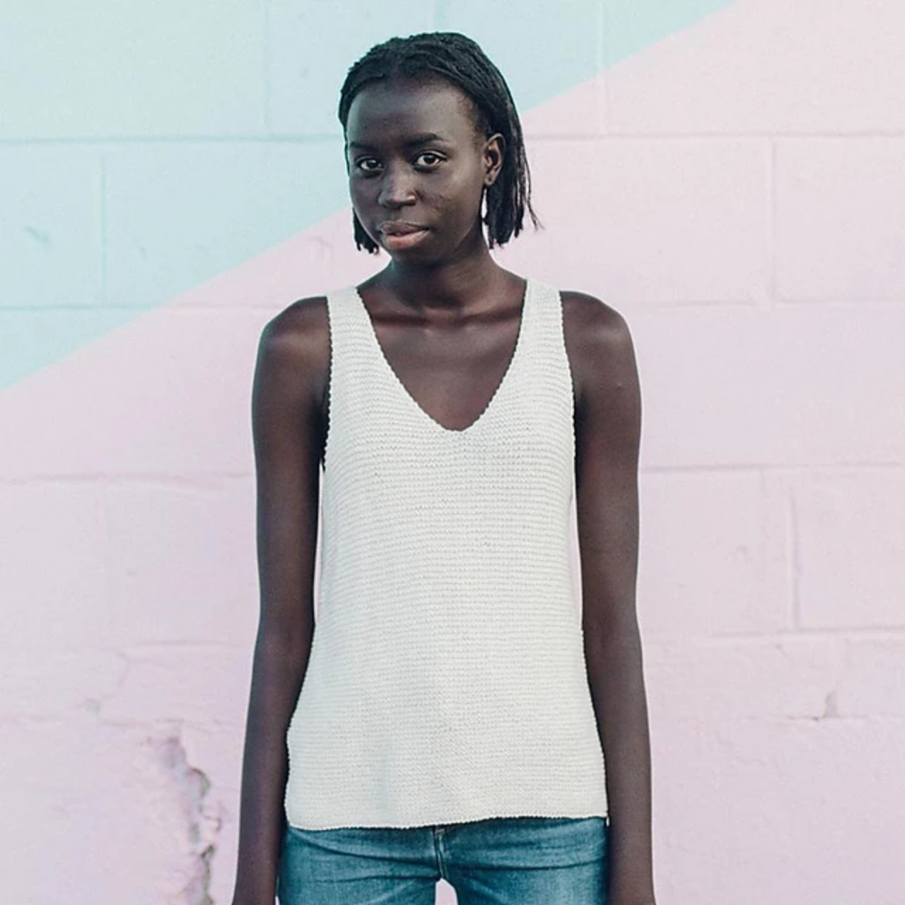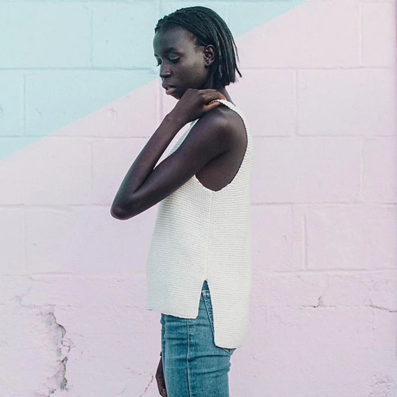 Pam Allen’s cotton tank is the epitome of effortless. Knitted flat from the bottom up in easy garter stitch, with a v-neck and split hem, the Auger tank is a fresh take on a cool summer classic.
