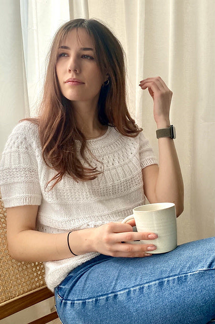 Sommerknus is a round yoke sweater worked from the top down with the possibility to adjust the length of the sleeves (short, 3/4 or long sleeves) and the body.