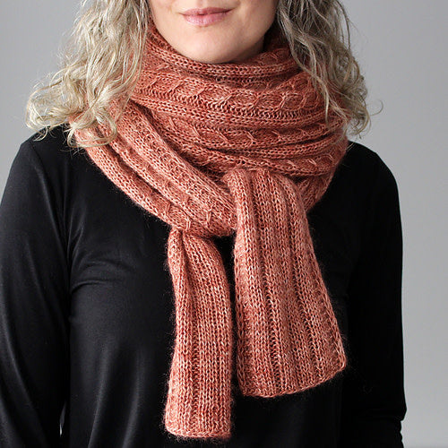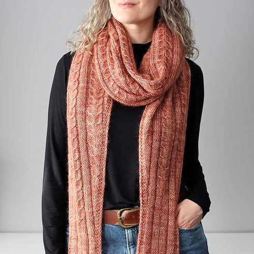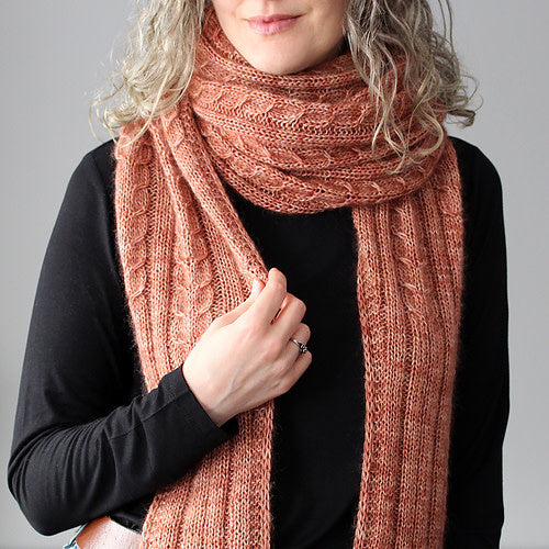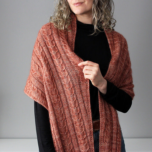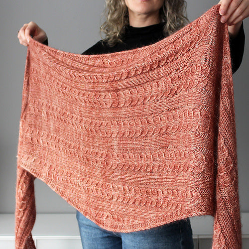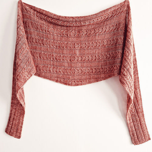 Beautiful large but delicate cables create a subtle, eye-catching texture on this wonderful cosy wrap. The bands of cables are framed by ribbing, and grow seamlessly in and out of the ribbed tips of the shawl.