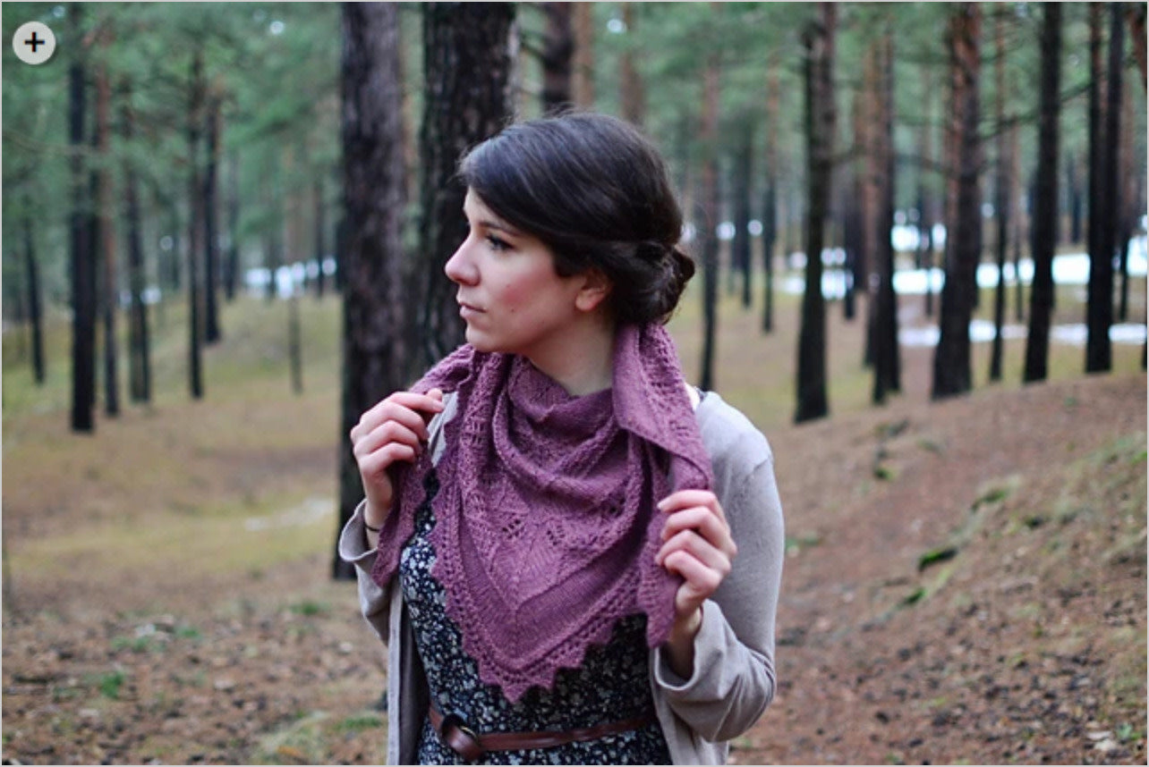 It is a triangular shawl with an interesting texture that will keep you entertained one row after the other. The lace and twisted stitches remain quite simple, making the pattern very accessible to advanced-beginner knitters, and a quick knit to more skilled knitters. The pattern features both charts and written instructions.