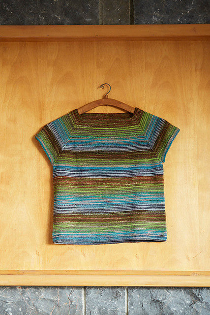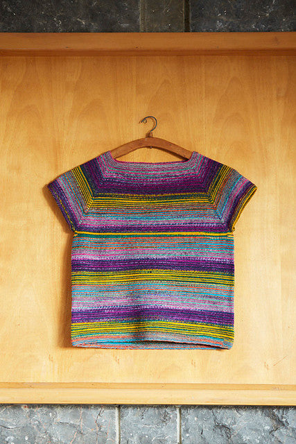 A top-down tee with raglan cap sleeves, in colorful stripes.