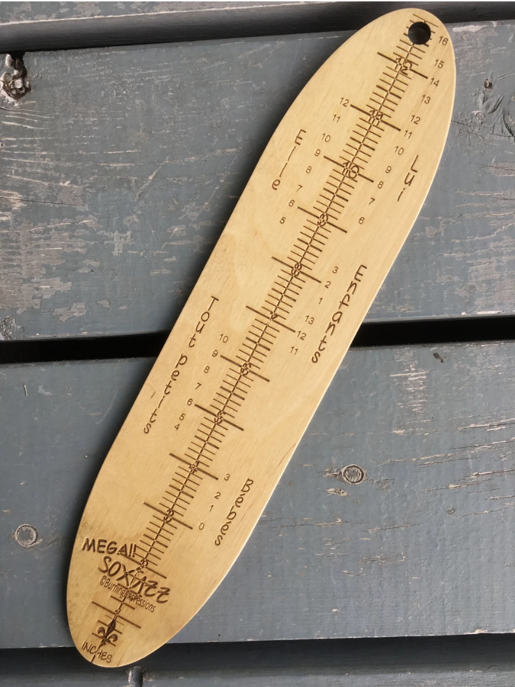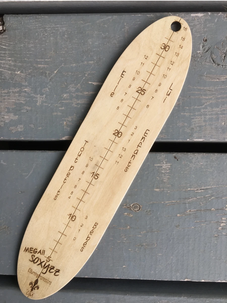Handmade by Burning Impressions of 150 Mile House, British Columbia, this handy gadget idea was born from constantly having to look for shoe sizing charts every time I wanted to make socks for someone else! With the Soxyzz, all you have to do is get your person to stand on the ruler, and voila! You have their size!! Or, if they're not right there handy, you can easily look up their shoe size on the Soxyzz and get the correct measurements.