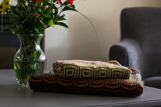 - Throw: 2145 Black/Cast Iron for MC, 2179 Chocolate, 2105 Oats, 2192 Chana Dal, 2175 Fennel, and 2176 Pumpkin for CCs - 5 skeins of MC, 1 skein each of CC.