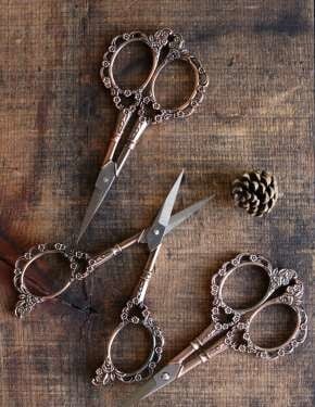 Embroidery scissors with high quality stainless steel blades and ornate floral scrollwork shaped handles. Perfect for snipping yarn tails and threads, these little beauties would make an elegant addition to any knitting bag or sewing basket.